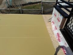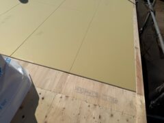 軸組み建て方を行い、屋根下地にはガルバ鋼板葺きなので合板の上にPBを貼りました。当然この上にはゴムアス系の