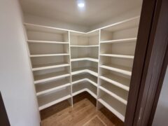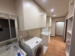 洗面脱衣室には洗面化粧台2台に洗濯機パンを2ヶ所と収納ユニットを取付て、パントリー内には可動棚を設置しました。