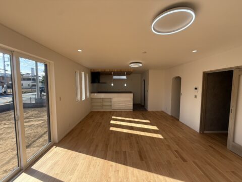 キッチン側から撮影した、広々とした23帖のリビングの様子です。